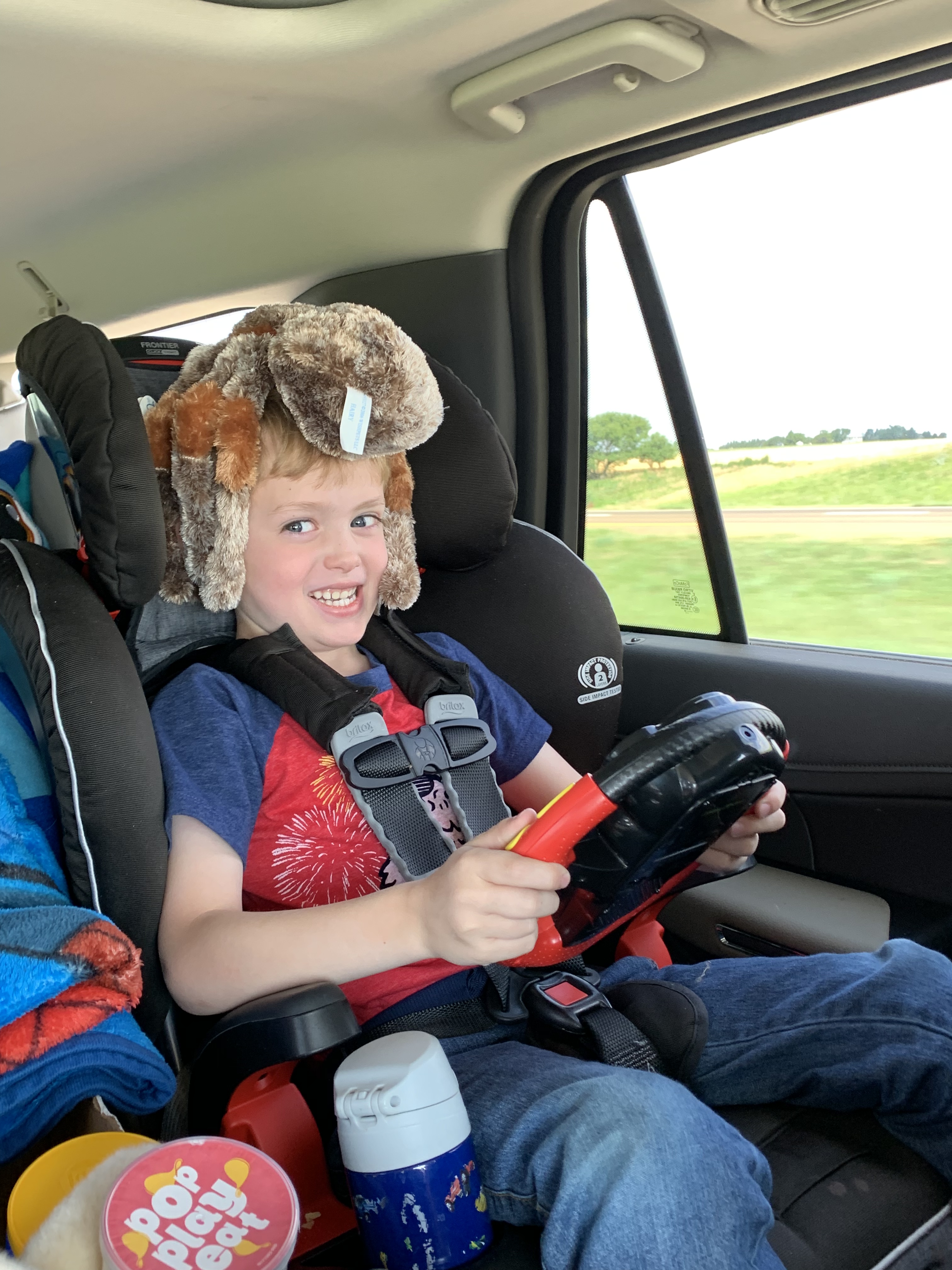 And let’s not forget Ben’s love of NASCAR. He spent a fair amount of time driving with his nascar wheel, HANS device (neck pillow not pictured here as I missed out on getting a shot with the neck pillow) and is that a plush spider for a helmet?