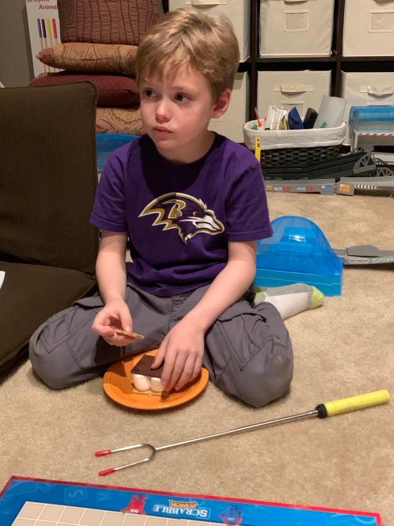 We ate our dinner of hot dogs and beans. The boys had some macaroni and cheese on the side. The S’mores dessert did not disappoint. For those that wanted the marshmallows toasted, I decided to use the broiler in the oven. They came out perfect. If the weather was better we could have roasted over the gas burner on the grill outside. Lots of options there.
