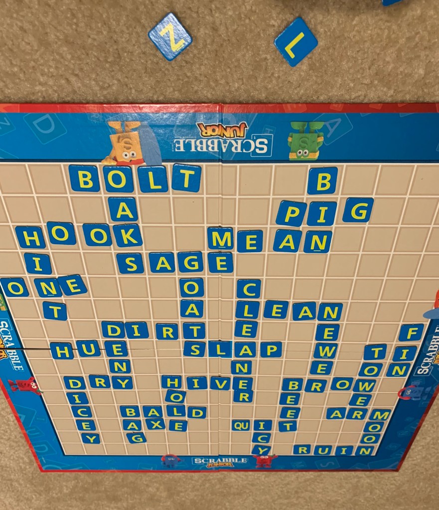 We played two rounds of Scrabble Junior first. This was Ben’s first time playing Scrabble and he did really well. He didn’t want any help with his words which was a main contributor to the late hour of the evening. At one point I said to him, “you look exhausted” to which he replied, “I am! But that doesn’t mean my brain isn’t still thinking”. He finally took some suggestions so as not to impact his Mab Lib and story events.